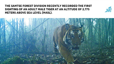 Samtse forest division recently recorded the first sighting of an adult male tiger in a remote camera trap at an altitude of 2,775 meters above sea level (masl).