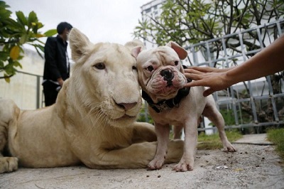 The lion plays with a dog at home in Phnom Penh, Cambodia on July 5, 2021.