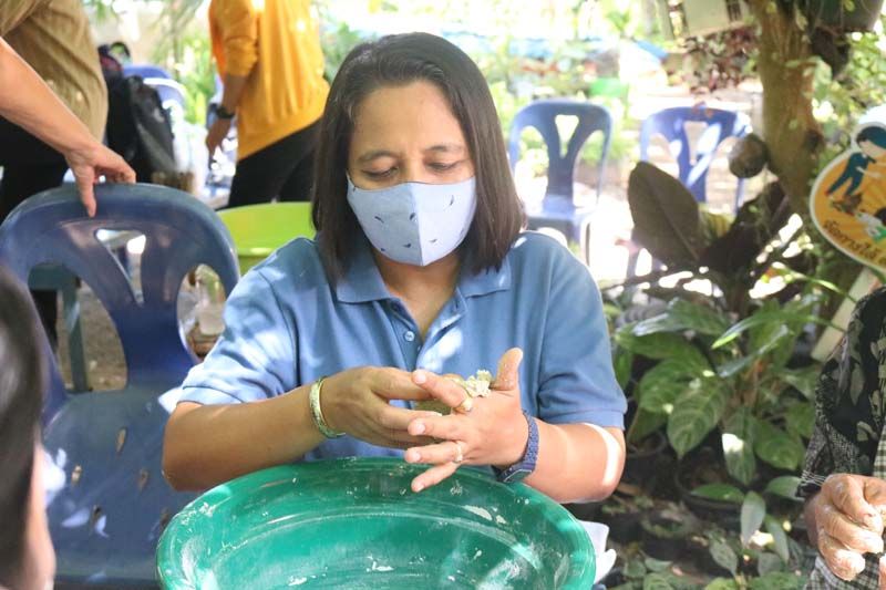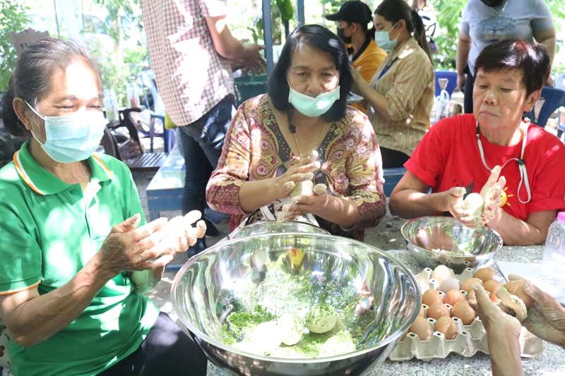 ทั้งนี้มี รศ.ดร.ชุตินุช สุจริต รองผู้อำนวยการสถาบันวิจัยและพัฒนา มทร.ศรีวิชัย อาจารย์ประจำสาขาเพาะเลี้ยงสัตว์น้ำ และผลิตภัณฑ์ประมง คณะวิทยาศาสตร์และเทคโนโลยีการประมง มทร.ศรีวิชัย วิทยาเขตตรัง เจ้าของแนวคิด ไข่เยี่ยวม้าที่ปลอดสารตะกั่ว สามารถลดคอเลสเตอรอล คือ “ไข่เยี่ยวม้าทองคำ” ที่การันตีคุณภาพระดับชาติ มาร่วมเป็นวิทยากรถ่ายทอดความรู้ในการแปรรูปไข่ไก่ โดยใช้วัตถุดิบที่มีอยู่ในชุมชนอย่างคุ้มค่า คือ ไข่ไก่จาก ก.ไก่ ฟาร์มอารมณ์ดี และใบเตยหอม แปรรูปร่วมกันให้เป็นไข่ไก่เค็มสมุนไพร ตามขั้นตอนกระบวนการผลิต รวมทั้งวิธีการเก็บรักษาที่เหมาะสม และร่วมกันพัฒนาปรับปรุงสูตรแนวคิดการทำไข่ไก่เค็มสมุนไพร เพื่อเพิ่มมูลค่าให้กับผลิตภัณฑ์ ยกระดับเศรษฐกิจและสังคมรายตำบลแบบบูรณาการ ให้เกิดการพัฒนาทักษะในการสร้างเสริมอาชีพใหม่ในชุมชนช่วงการแพร่ระบาดไวรัสโควิด – 19 ซึ่งผู้เข้ารับการอบรมสามารถนำความรู้ดังกล่าวไปประกอบอาชีพเสริม อาชีพหลัก สร้างรายได้ แบบ WFH ที่บ้านได้