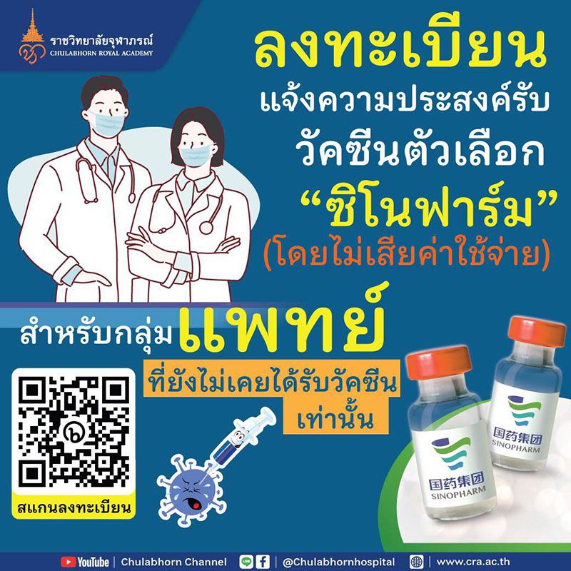 สามารถลงทะเบียนแจ้งความประสงค์เพื่อเข้ารับวัคซีนซิโนฟาร์มกับราชวิทยาลัยจุฬาภรณ์ ได้ทาง https://bit.ly/FormForDoc โดยไม่เสียค่าใช้จ่าย