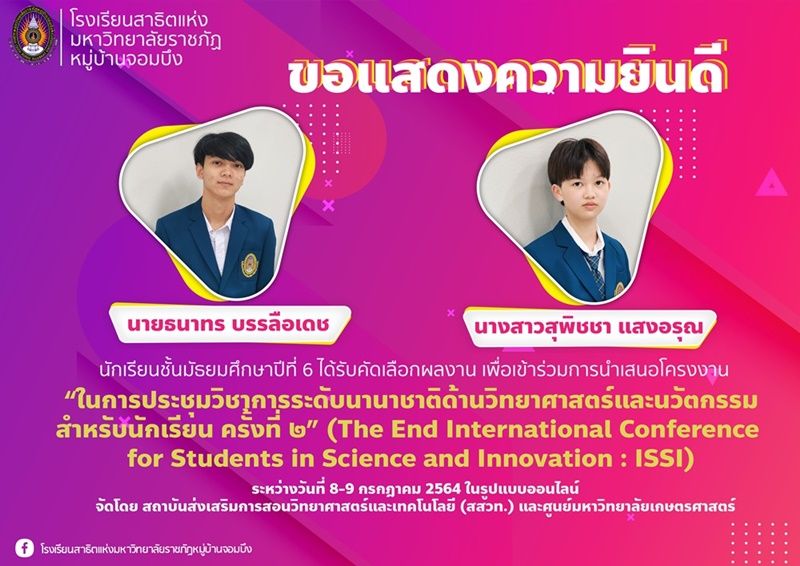 2 นักเรียนโรงเรียนสาธิตแห่งมหาวิทยาลัยราชภัฏหมู่บ้านจอมบึง ได้รับคัดเลือกผลงานเพื่อเข้าร่วมการนำเสนอโครงงานในการประชุมวิชาการระดับนานาชาติ ด้านวิทยาศาสตร์และนวัตกรรม ในรูปแบบออนไลน์