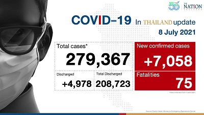Thailand’s daily caseload hit a brand new high on Thursday with 75 deaths and 7,058 new cases, pushing the total infections and deaths in the country to 308,230 and 2,462 respectively.