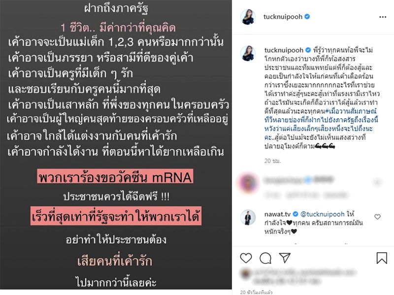 ซึ่งตั๊กได้โพสต์รูปภาพซึ่งมีข้อความฝากถึงรัฐบาล ซึ่งระบุว่า 1 ชีวิตมีค่ากว่าที่คุณคิด เค้าอาจจะเป็นแม่เด็ก 1, 2, 3 คน หรือมากกว่านั้น เค้าอาจเป็นภรรยา หรือสามีที่ดีของคู่เค้า เค้าอาจเป็นครูที่มีเด็กๆ รัก และชอบเรียนกับครูคนนี้มากที่สุด