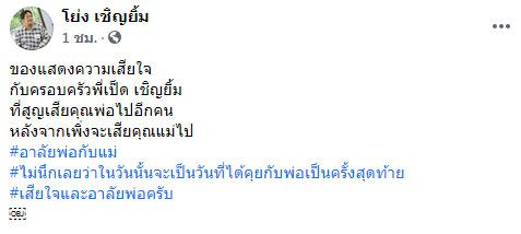 ทั้งนี้ เป็ด เชิญยิ้ม ได้กล่าวตอบคอมเมนต์ผู้ใช้เฟซบุ๊กรายหนึ่งว่า คุณพ่อได้จากไปตอนตี 5 ของวันนี้