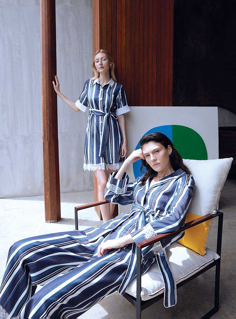 “Stripe A Lace” คือการผสมผสานองค์ประกอบที่มีความขัดแย้งเข้าไว้ด้วยกัน นับเป็นอีกหนึ่งซิกเนเจอร์และวิธีการทำงานในแบบฉบับ ASAVA ในกรุ๊ปนี้จะโดดเด่นที่การผสมผสานระหว่างผ้าลูกไม้ที่ให้ความอ่อนหวาน เข้ากับซิลูเอทและผ้าชุดผู้ชายอย่างผ้าลาย Pinstripe รวมไปถึงการมิกซ์แอนด์แมทช์ที่ผสมผสานความเป็นเฟมินีนและมาสคิวลีนได้อย่างลงตัว เช่น เบลาส์ลูกไม้จับคู่กับกางเกงทรงเทเลอร์ หรือคีย์ลุคอย่าง เสื้อคลุม (Robe Jacket) และกางเกงเข้าชุดที่ลดทอนความแข็งด้วยดีเทลผ้าลูกไม้บริเวณปลายแขนและปลายขากางเกง