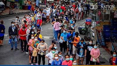 Long lines of people queued up to receive free Covid-19 tests at Mahanak Market in Bangkok’s Dusit district on Friday (July 9).