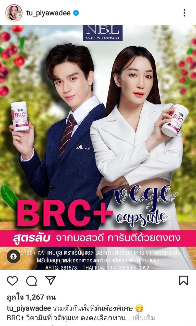 ล่าสุดทำเอาคดีพลิกซะแล้ว เมื่อ “ตู่ ปิยวดี” โพสต์ภาพพร้อมข้อความว่า “รวมตัวกันทั้งทีมันต้องพิเศษ BRC+ วิตามินที่ วดีทุ่มเท ตงตงเลือกทาน BRC+ #Cranberry #Rosehip #Broccoli #Zinc #VitaminC วิตามินอัดแน่นในรูปแบบซอฟเจลทานง่าย ผลิตจากประเทศออสเตรเลีย ทานทุกวัน แล้วคุณจะรักผิวของคุณ @nubolic”