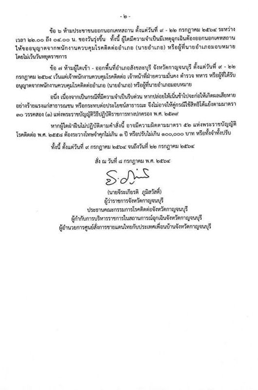 เมื่อเวลาประมาณ 21.30 น.วันที่ 8 ก.ค.64 เพจ “แดนสวรรค์ตะวันตก” ได้โพสต์ข่าวด่วนโดยมีเนื้อหาดังนี้ “ด่วนที่สุด !!! จังหวัดกาญจนบุรีประกาศล็อกดาวน์ ปิดอำเภอสังขละบุรี ห้ามคนเข้า-ออกพื้นที่, ปิดจุดผ่อนปรนการค้าด่านพระเจดีย์สามองค์, งดการเดินรถโดยสารประจำทาง ช่วงทองผาภูมิ-สังขละบุรี และประกาศเคอร์ฟิวส์ ห้ามบุคคลในพื้นที่ออกนอกเคหสถาน ตั้งแต่เวลา 22.00-04.00 น. เป็นระยะเวลา 14 วัน เริ่มพรุ่งนี้ (9-22 ก.ค. 64) ทั้งนี้เนื่องจากสถานการณ์การแพร่ระบาดของโรคติดเชื้อไวรัสโคโรนา 2019 ที่เริ่มทวีความรุนแรง และมีผู้ป่วยติดเชื้อในพื้นที่เพิ่มสูงขึ้น”