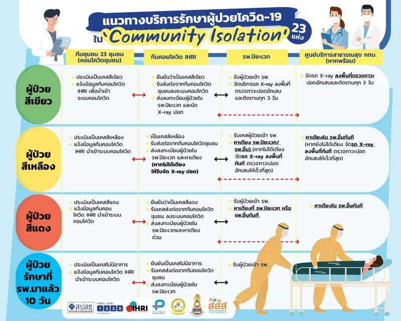 ซึ่งกรณีผู้ป่วยกลุ่มสีเขียวที่อยู่ในระบบการดูแลผู้ป่วยโควิด-19 ที่บ้าน หรือในชุมชน ก็จะได้รับปรอทวัดไข้ วัดค่าออกซิเจนปลายนิ้ว และเอกซเรย์ปอดทุกคน เป็นเหมือนการไปรักษาที่โรงพยาบาลหรือโรงพยาบาลสนามแต่ระบบนี้เป็นการนำเครื่องมือแพทย์และยารักษาออกมาให้บริการที่ชุมชนแทน ทั้งนี้ ผู้ติดเชื้อโควิด-19 หากต้องการเข้าสู่ระบบการดูแลผู้ป่วยโควิด-19 ที่บ้าน หรือในชุมชน สามารถติดต่อได้หลายช่องทาง เช่น โทร.สายด่วน สปสช. 1330 ซึ่งจะมีการประสานมาที่ทีมคอมโควิด IHRI หรือติดต่อมายังทีมคอมโควิด IHRI แอดไลน์ @comcovid-19 โดยตรง