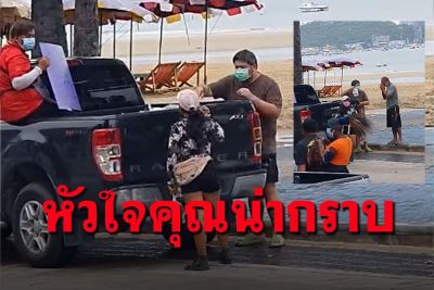 12 ก.ค.64 ต้องออกปากว่าอยากกราบหัวใจคนในคลิปมากๆ เมื่อผู้ใช้เฟซบุ๊ก Anucha Kaewtham ได้โพสต์คลิปสั้นๆ เพียง 1.48 นาที ที่เต็มเปี่ยมไปด้วยความรู้สึกดีกับภาพที่อยู่ตรงหน้า ที่เกิดขึ้นริมชายหาด ซึ่งมีรถกระบะภายในมีอาหาร จัดใส่เป็นถุง โดยมีผู้ชาย 2 คน อีกคนนั่งถือป้ายบอก อีกคนคอยหยิบถุงยื่นให้ชาวบ้านที่่มารอรับ