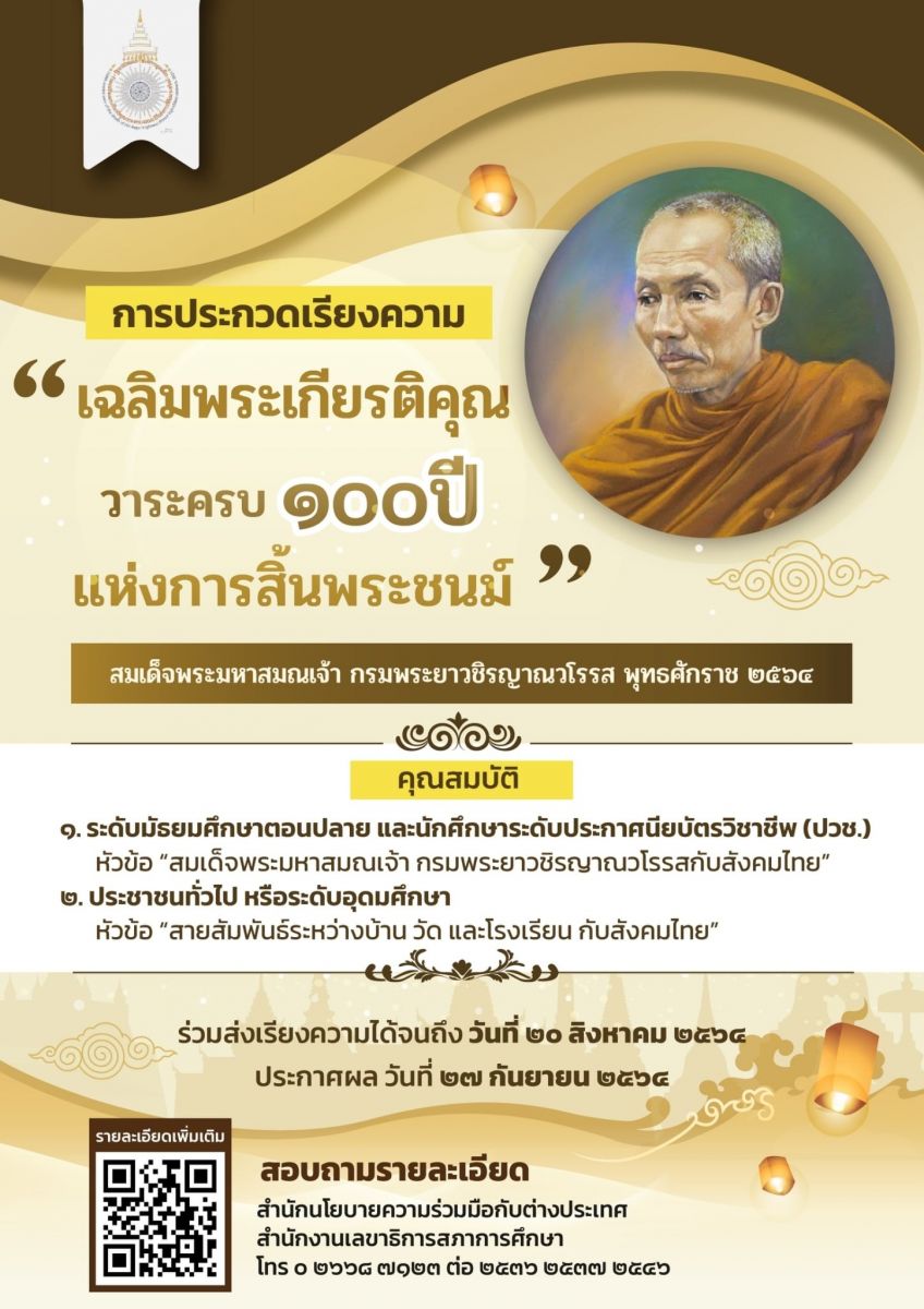 “สมเด็จพระมหาสมณเจ้า กรมพระยาวชิรญาณวโรรส ทรงวางรากฐานการศึกษาของพระภิกษุสามเณรเพื่อการศาสนาและการศึกษาของประชาชน โดยทรงอำนวยการจัดการศึกษาในหัวเมืองทั่วพระราชอาณาจักร และใช้วัดเป็นสถานที่ในการศึกษา โดยทรงเห็นว่า วัดเป็นแหล่งประเพณีและเป็นศูนย์รวมของประชาชน พระองค์จึงทรงเป็นผู้วางรากฐานการศึกษาระดับประถมศึกษาและการศึกษาภาคบังคับของไทยมาจนถึงปัจจุบัน การจัดการประกวดเรียงความครั้งนี้จึงเป็นการเปิดให้ประชาชนได้มีส่วนร่วมในการสดุดีพระเกียรติคุณและรำลึกถึงพระองค์ท่านในฐานะบุคคลสำคัญของประเทศและสากลสืบไป”เลขาธิการสภาการศึกษากล่าวและว่า สำหรับการประกวดเรียงความ แบ่งเป็น 1.ระดับมัธยมศึกษาตอนปลาย และนักศึกษาระดับประกาศนียบัตรวิชาชีพ (ปวช.)หัวข้อ “สมเด็จพระมหาสมณเจ้า กรมพระยาวชิรญาณวโรรสกับสังคมไทย” และ 2. ประชาชนทั่วไป หรือระดับอุดมศึกษา หัวข้อ “สายสัมพันธ์ระหว่างบ้าน วัด และโรงเรียน กับสังคมไทย เงินรางวัลสูงสุด 10,000 บาท โดยส่งเรียงความได้ตั้งแต่วันนี้ – 20 สิงหาคม 2564 ประกาศผลรางวัล วันที่ 27 กันยายน 2564 นี้ อ่านรายละเอียดเพิ่มเติม https://rebrand.ly/n7sq9e1 หรือ สอบถามที่สำนักนโยบายบความร่วมมือกับต่างประเทศ สำนักงานเลขาธิการสภาการศึกษา โทร.0-2668-7123 ต่อ 2536 , 2537 , 2546