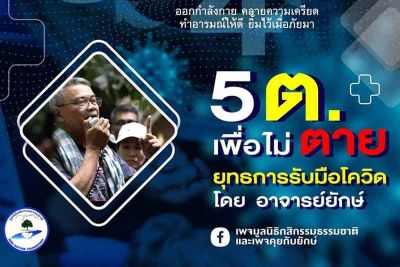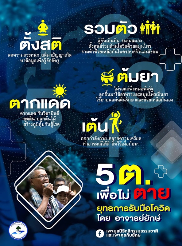 วันที่ 12 ก.ค.64 เพจ “มูลนิธิกสิกรรมธรรมชาติ” และเพจ “คุยกับยักษ์” ได้โพสต์ข้อความแนวทางการประกาศต่อสู้กับโควิด-19 ด้วยยุทธการ “5 ต.เพื่อไม่ตาย ยุทธการต้านโควิด” โดยอาจารย์ยักษ์ ครูใหญ่มหาลัยคอกหมู” โดยมีเนื้อหาดังนี้