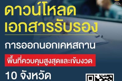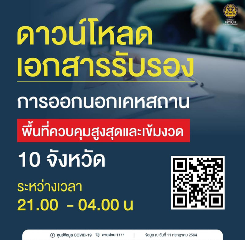 ล่าสุด เพจเฟซบุ๊กศูนย์โควิด ได้โพสต์ภาพพร้อมข้อความ ไฟล์เอกสารรับรองความจำเป็นสำหรับการออกนอกเคหสถานในระหว่างเวลา 21.00 – 04.00 น. (ไฟล์นี้เป็นตัวอย่างสำหรับหน่วยงานไปประยุกต์ใช้) ในพื้นที่กรุงเทพมหานคร และจังหวัดปริมณฑล (นครปฐม นนทบุรี ปทุมธานี สมุทรปราการ และสมุทรสาคร) และจังหวัดชายแดนภาคใต้ (นราธิวาส ปัตตานี ยะลา และสงขลา)