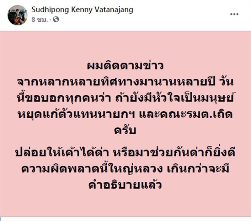 ล่าสุดในเฟซบุ๊กของนักแต่งเพลง นักร้องคนดัง ชมพู ฟรุตตี้ ได้โพสต์ข้อความระบุว่า “ผมติดตามข่าว จากหลากหลายทิศทางมานานหลายปี วันนี้ขอบอกทุกคนว่า ถ้ายังมีหัวใจเป็นมนุษย์ หยุดแก้ตัวแทนนายกฯ และคณะรมต.เถิดครับปล่อยให้เค้าได้ด่า หรือมาช่วยกันด่าก็ยิ่งดี ความผิดพลาดนี้ใหญ่หลวง เกินกว่าจะมีคำอธิบายแล้ว