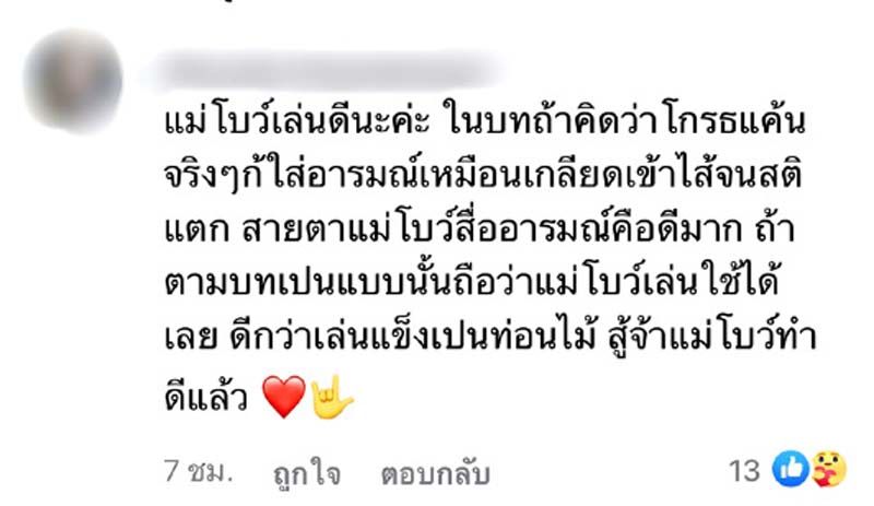 “ก็มีคนส่งมาให้เห็นเหมือนกัน เหมือนคนดูไลฟ์สดในเพจช่อง 8 เค้าก็จะสามารถมีฟีดแบ๊กกลับมาได้ทันที แล้วมันเป็นฉากที่เราโดนจับ ตอนแรกเหมือนทุกคนก็บอกให้เราหนีไป ลุ้นให้เรารอด พอหลังจากที่ สามีเราในเรื่องอย่างพี่เอ็ม ที่เค้าเล่นเป็นสนอง โดนซ้อมจนเรืองฆ่าตัวตาย เราก็ได้แต่ร้องกรี๊ดๆ เท่านั้นแหละ รถทัวร์พร้อมมาจอดแฟนๆ อินหนักมารัวคอมเมนท์ว่า เอมทำไมโง่แบบนั้นแบบนี้ ก็คือจัดเต็มมาก แต่ไม่โกรธนะคะ เพราะว่าเค้าคงอินในบทบาทที่เราได้แสดงไป แต่ก็มีเสียงที่ชมเหมือนกันว่า ไม่เคยเห็นเราเล่นบทแบบนี้ที่ไหนได้สู้คนได้ร้าย ได้ชี้หน้าด่า หัวเราะสะใจ ก็ขอบคุณทุกกระแสตอบรับมากๆ เลยนะคะ เพราะยอมรับเลยว่าตอนถ่ายทำซีนพวกนี้ ยากมากเราเองก็ใหม่มากๆ กับทางด้านอาชีพนี้ การที่จะถ่ายทอดบทบาทออกมาให้อินเราทำการบ้านเยอะมาก ขอบคุณผู้กำกับ ขอบคุณทุกๆ คนทีช่วยผลักดันโบว์ และเชื่อมั่นว่าเราทำได้ ถามว่าชอบไหม ชอบนะโบว์คิดว่า ในเรื่องการแสดง เป็นอีกหนึ่งสิ่งที่เราก็ฝันไว้ตั้งแต่เด็กๆ แล้วพอเราได้รับโอกาส เราทำมันเต็มที่ ทุกครั้งที่เราทำมันเต็มที่ ผลมันจะออกมายังไง เราก็รู้สึกว่า เราได้ทำเต็มที่แล้วแหละ แต่เราก็คาดหวังอยากจะให้ผู้ชมชอบ แต่พอทุกอย่างออกมาดีก็รู้สึกดีใจและอยากจะขอบคุณทุกคนจากหัวใจจริงๆ ค่ะต้องติดตามต่อว่าเอมอีกโหมดนึงจะน่ากลัวขนลุกแค่ไหนเพราะต้องเป็นผีมาหลอกหลอนคนชั่ว ติดตามได้ ในละคร“เวราอาฆาต”ออกอากาศทุกวันจันทร์-พฤหัสบดี เวลา 19.00 น. ทางช่อง 8 กดเลข 27”