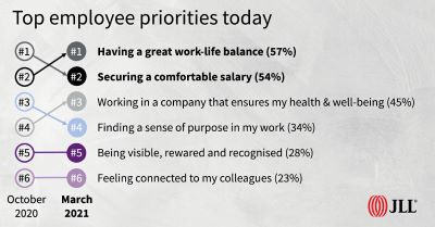 “Apart from work-life balance and salary, the pandemic has driven people to focus on what matters most in their work lives – a desire for spaces that create a strong sense of community and culture,” said Kamya Miglani, director of Work Dynamics Research at JLL Asia Pacific.