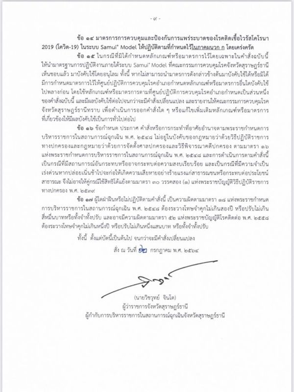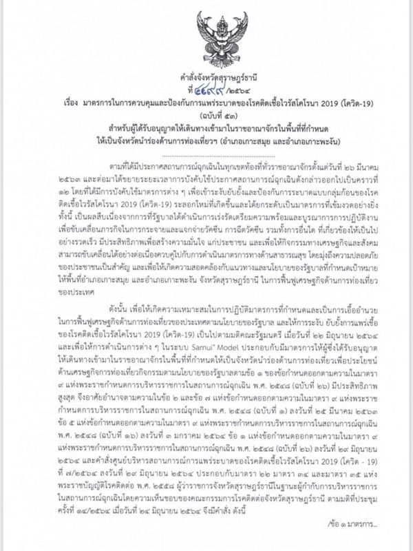 วันที่ 13 ก.ค.64 ผู้สื่อข่าวรายงานว่า นายวิชวุทย์ จินโต ผู้ว่าราชการจังหวัดสุราษฎร์ธานี ได้มีคำสั่งจังหวัดสุราษฎร์ธานี ที่ 4499/2564 ลงวันที่ 12 กรกฎาคม 2564 มาตรการเร่งด่วนในการป้องกันการแพร่ระบาดของโรคติดเชื้อไวรัสโคโรนา 2019 (โควิด-19) ฉบับที่ 53 สำหรับผู้ได้รับอนุญาตให้เดินทางเข้ามาในราชอาณาจักรในพื้นที่กำหนดเป็นจังหวัดนำร่องด้านการท่องเที่ยว ตามที่คณะรัฐมนตรีมีมติกำหนดในพื้นที่เป้าหมายเกาะสมุย เกาะพะงัน เกาะเต่า เปิดรับนักท่องเที่ยวต่างชาติวันที่ 15 ก.ค.64 ในระบบสมุย พลัส โมเดล (Samui+Model) โดยจังหวัดได้กำหนด 6 มาตรการปฏิบัติของนักท่องเที่ยวต่างชาติ ตั้งแต่เดินทางเข้ามายังพื้นที่จนถึงกลับออกไป