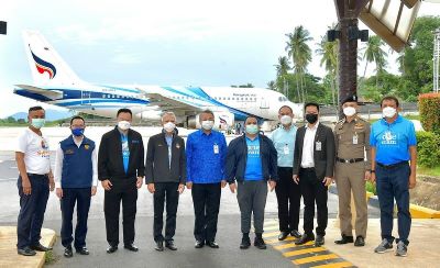 Mr. Yuthasak Supasorn (3rd from left) and Suratthani Governor by Mr. Wichawut Jinto (5th from left), jointly organized a welcome ceremony for an inaugural flight (PG5125) from Bangkok to Samui at Samui Airport, Suratthani province. The inaugural flight is a special flight under the Samui Plus Model Project that accommodates transit/transfer international passengers who are connecting from Bangkok (Suvarnabhumi) to Koh Samui and/or onward to Koh Tao, Koh Phan-Ngan.