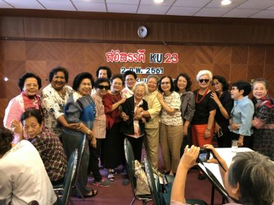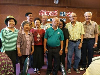 วันที่ 2 กุมภาปีนี้สมกับเป็นวัน Home coming day จริงๆเพราะมีเพื่อนๆกลับมาเยี่ยมบ้านกันอย่างมากมายแบบเข็มขัดสั้น(คาดไม่ถึง)มากันจากทั่วสารทิศทั้งเหนือและใต้ ตัวแทนรุ่นฯที่มาวางพวงมาลาอนุสาวรีย์ 3 บูรพคณาจารย์ก็มากกว่าปีที่แล้ว ปีนี้มากันถึง 11 คน มี ** ดร.สงคราม **เป็นคนจัดหารีดและจองคิวเราได้คิวที่ 41 เพราะอยากรอให้เพื่อนๆมากันมากๆรวมแล้วปีนี้ได้ถีง 11 คน คือ ดร.สงคราม ศ.ดร.เอิบ ประดิษฐ์ นิตยา มาลัยวรรณ แฟง–ยุพาพรรณ ดร.ชาญชัย ชาญ ชัยวัฒน์ สมคิด+มาลี และวันชัย หลังวางพวงมาลาบางคนก็แยกย้ายไปรดน้ำขอพรอาจารย์ที่หอประชุม บางคนก็ไปตั้งหลักที่สหโภชน์เลยเพราะมีข้าวต้มรออยู่
