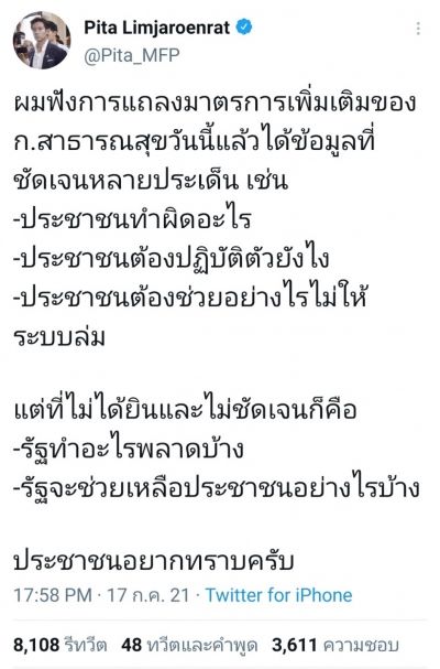 นายพิธา ลิ้มเจริญรัตน์ หัวหน้าพรรคก้าวไกล ทวิตข้อความผ่านทวิตเตอร์ Pita Limjaroenrat หลังกระทรวงสาธารณสุขแถลงข่าว สถานการณ์และมาตรการป้องกัน โควิด-19 เมื่อ 16.00 น. ที่ผ่านมา ว่า ผมฟังการแถลงมาตรการเพิ่มเติมของกระทรวงสาธารณสุขในวันนี้ เราได้ข้อมูลที่ชัดเจนหลายประเด็น เช่น ประชาชนทำอะไรผิด? ประชาชนต้องปฏิบัติตัวอย่างไร? ประชาชนต้องช่วยอย่างไรไม่ให้ระบบล่ม?