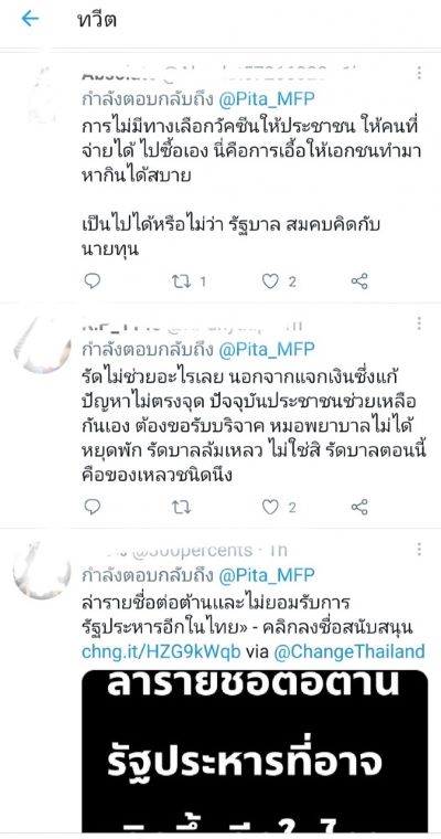 ทั้งนี้ได้มีชาวทวิตเตอร์โดยเข้ามาแสดงความคิดเห็นจำนวนมาก อาทิ ฟังแล้วคือประชาชนต้องดูแลตัวเอง ตามนั้น ตามนี่ สั่งอย่างเดียว และรัฐบาลทำอะไร สาธารณสุขทำอะไร ผ่านมากี่วัน เจรจามันไม่นาน ถ้าไม่คุยจะรู้ได้ไหมว่าต้องปรับแผนการอย่างไรรับเถอะว่าสาธารณสุขมันล้มเหลว, รัฐไม่ช่วยอะไรเลย นอกจากแจกเงินซึ่งแก้ปัญหาไม่ตรงจุด ปัจจุบันประชาชนช่วยเหลือกันเอง ต้องขอรับบริจาค หมอพยาบาลไม่ได้ รัฐบาลล้มเหลวไม่ใช่สิรัฐบาลตอนนี้คือของเหลวชนิดหนึ่ง, อยากได้ยินคำขอโทษจากรัฐบาลและผู้บริหารที่เกี่ยวข้องที่ทำให้การบริหารจัดการล้มเหลวได้ขนาดนี้ ไม่ใช่คำแถไปวัน ๆ แบบนี้,