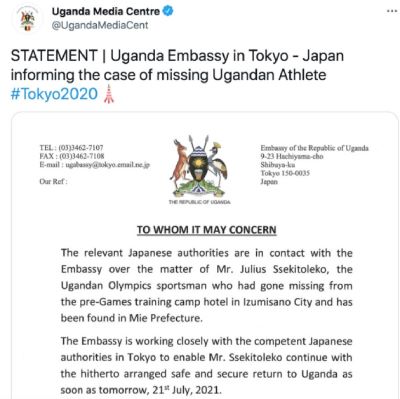 Hamsom Obua, Uganda’s minister of state for sports, said it is good news that Ssekitoleko has been found.