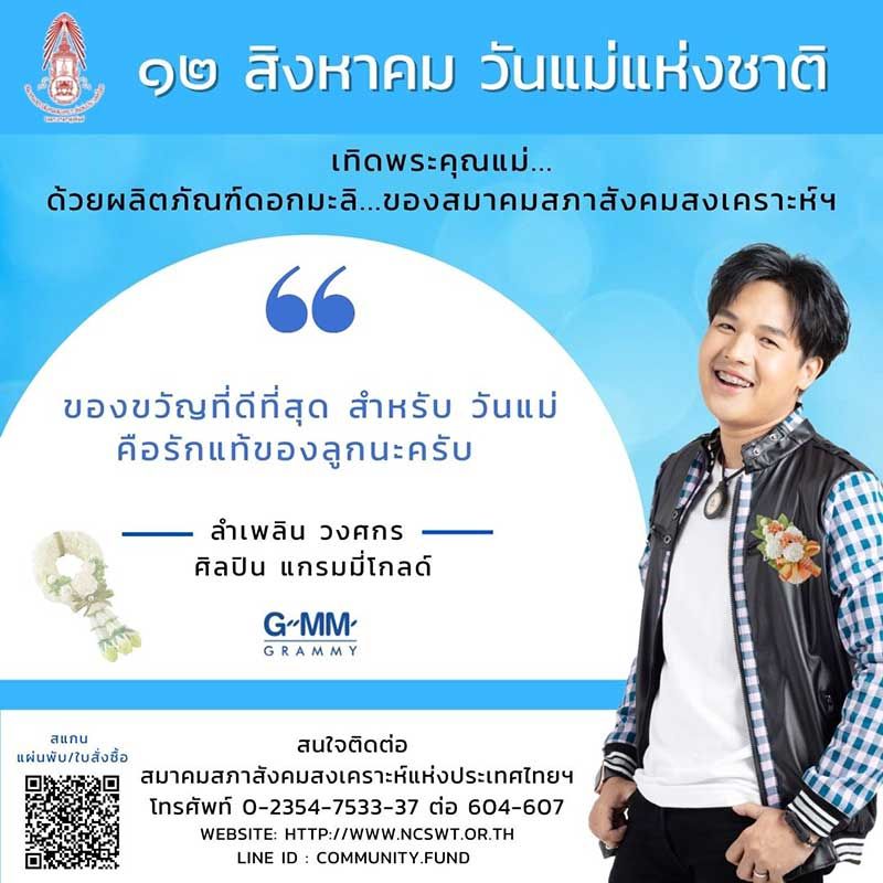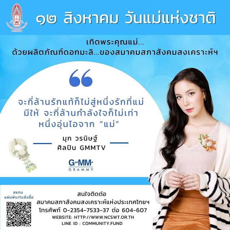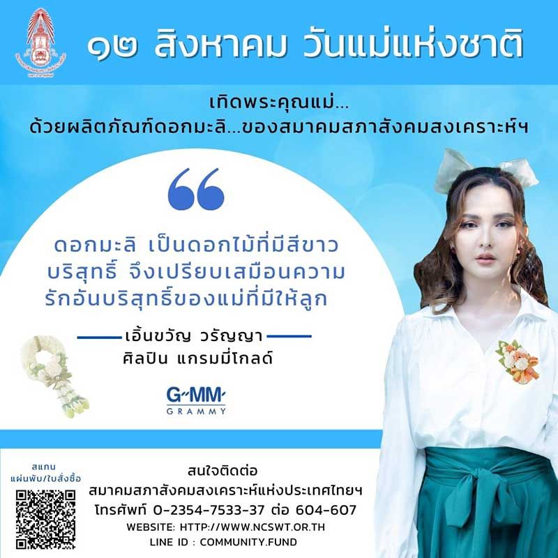 เนื่องในโอกาสวันแม่แห่งชาติ 12 สิงหาคม ใกล้จะมาถึงแล้ว ศิลปินแกรมมี่มุก-วรนิษฐ์ ถาวรวงศ์, ลำเพลิน-วงศกรณ์โยวะราช, เอิ้นขวัญ-ศรัญญามะหาวงค์ และ นนน-กรภัทร์ เกิดพันธุ์ร่วมเชิญชวนลูกๆ ทั่วประเทศบอกรักคุณแม่ด้วยผลิตภัณฑ์ดอกมะลิวันแม่แห่งชาติ ประจำปีของสภาสังคมสงเคราะห์แห่งประเทศไทย ในพระบรมราชูปถัมภ์ ทั้งนี้รายได้ส่วนหนึ่งทูลเกล้าฯ ถวายโดยเสด็จพระราชกุศลตามอัธยาศัย และช่วยเหลือผู้ประสบปัญหาความทุกข์ยากเดือดร้อน ผู้พิการ ผู้สูงอายุ และมอบเป็นทุนการศึกษาแก่เด็กยากจนและขาดแคลนทั่วประเทศ รวมทั้งการช่วยเหลือประชาชนกลุ่มเปราะบางของสังคมที่ได้รับผลกระทบจากสถานการณ์แพร่ระบาดของเชื้อไวรัสโคโรนา 2019 (COVID-19) โดยเหล่าศิลปินยังได้ร่วมโพสต์ภาพประชาสัมพันธ์ผ่านช่องทางโซเชียล เพื่อเชิญชวนให้ประชาชนร่วมกันอุดหนุนผลิตภัณฑ์ดอกมะลิอีกด้วย ผู้สนใจสอบถามรายละเอียดและสั่งซื้อได้ที่สมาคมสภาสังคมสงเคราะห์ฯ สี่แยกตึกชัย ถนนราชวิถี และที่ธนาคารพาณิชย์ทุกแห่งทั่วประเทศ โทรศัพท์02-3547533-37 ต่อ 604-607 และ 417 หรือสั่งซื้อทาง Line ID : uwthailandสร้างบุญ สร้างกุศล ด้วยการซื้อผลิตภัณฑ์ดอกมะลิจากสมาคมสภาสังคมสงเคราะห์ฯ
