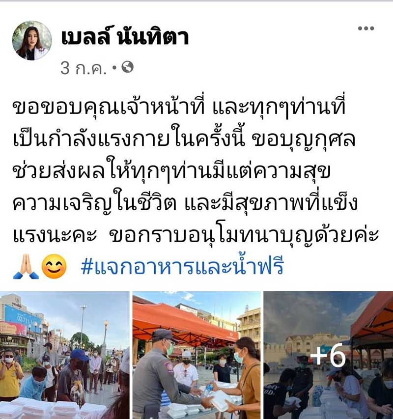 “รู้สึกเห็นใจหลายคนที่เค้าไปต่อไม่ได้ เค้าคือคนปกติที่ตกงานไม่มีรายได้ เบลล์และครอบครัวจึงร่วมกันทำอาหารและน้ำดื่มแจก พยายามจะทำให้ได้อาทิตย์ละ 1 ครั้งก็ยังดี ดีใจที่ได้เป็นส่วนหนึ่งที่ได้ช่วยเหลือคนไทยด้วยกันค่ะ”นอกจากนี้ ยังได้ร่วมทำบุญกับ “นุ่น-รมิดา ประภาสโนบล” เพื่อนรักอยู่สม่ำเสมอเมื่อมีโอกาสไม่ว่าจะเป็นการบริจาคเตียงคนไข้สำหรับผู้ป่วย โควิด-19การไถ่ชีวิตโค-กระบือทุกครั้งที่ได้ทำบุญเจ้าตัวก็รู้สึกอิ่มเอมใจที่ได้ช่วยคนบ้านเดียวกันแม้จะไม่มากมายดั่งใครเขาแต่น้ำใจที่มีต่อคนบ้านเกิดเมืองนอนเต็มร้อยเปอร์เซ็นต์จ้า