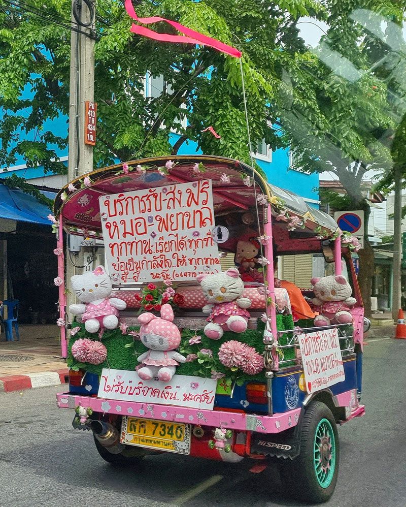 22 ก.ค.64 ผู้ใช้เฟซบุ๊ก Thapat Chawakaipan เผยภาพน่ารักๆ ของพี่สามล้อที่ตกแต่งด้วยการ์ตูนคิตตี้สีหวานแหว๋ว พร้อมเขียนป้ายด้วยลายมือเด่นชัดว่า