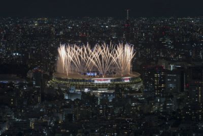 Fireworks explode over the Olympic Stadium during the opening ceremony of the Tokyo 2020 Olympic Games in Tokyo, Japan, July 23, 2021.