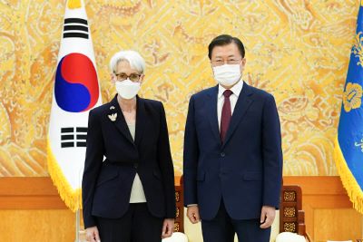 Sherman met with South Korean Foreign Minister Chung Eui-yong in the morning, discussing bilateral, regional and global issues, as well as follow-up measures to the outcome of the summit between Presidents Moon Jae-in and Joe Biden in May.