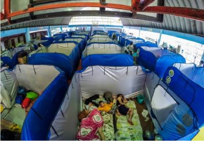 A family is seen inside an emergency modular tent as they take shelter at an evacuation center in Marikina City, the Philippines on July 24, 2021.