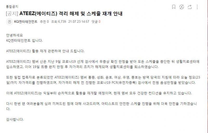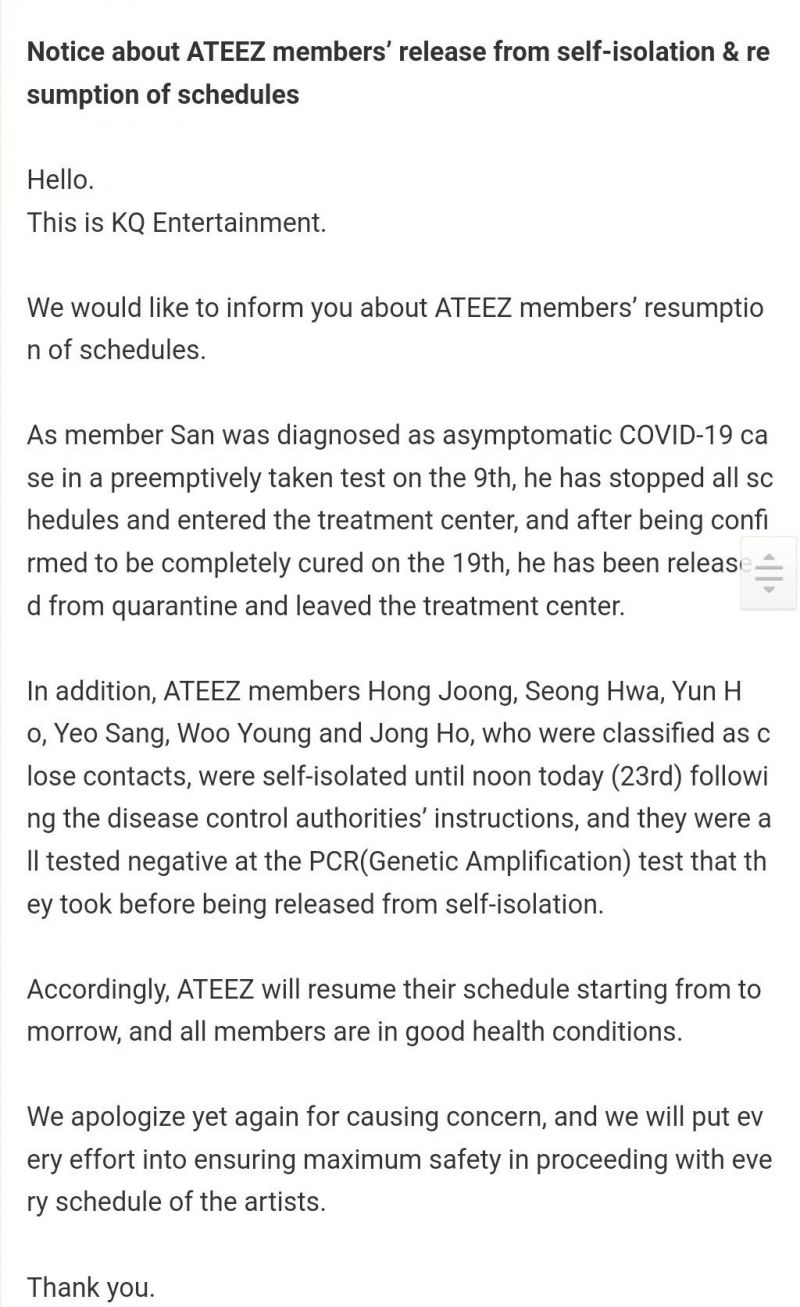 เมื่อวันที่ 23 กรกฎาคม ที่ผ่านมา บริษัท เคคิว เอนเตอร์เทนเมนต์ ต้นสังกัดของทั้ง 8 หนุ่ม ได้ออกประกาศข่าวดีให้เอทินี่ (ชื่อกลุ่มแฟนคลับของเอทีซ) ได้หายห่วงว่า ผลการตรวจเพาะเชื้อหลังผ่านการกักตัวมาครบ 14 วันของสมาชิกทุกคนในตอนนี้ ผลปรากฏว่าเป็นลบ ไม่พบเชื้อโควิด 19 แล้ว ถือว่าเป็นข่าวดีที่สมการรอคอยและหวังว่าการกลับมาของสมาชิกวง ATEEZ จะสร้างความยิ่งใหญ่อีกครั้งดังสโลแกน #8makes1team