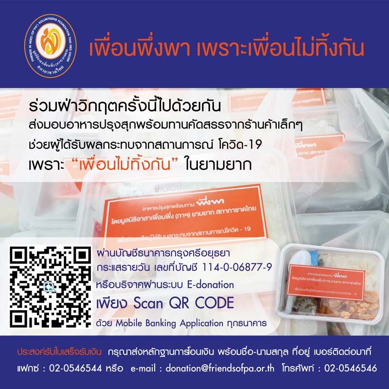 สำหรับผู้มีจิตศรัทธา ที่จะให้มูลนิธิฯ ส่งต่อน้ำใจไปช่วยเหลือในโครงการ “เพื่อนพึ่งพา เพราะเพื่อนไม่ทิ้งกัน” สามารถบริจาคสมทบทุนมูลนิธิฯ โดยสแกนQR Code ผ่าน Application ธนาคารในระบบE-donations ได้ทุกธนาคาร หรือโอนเงินผ่านธนาคารกรุงศรีอยุธยา ประเภทกระแสรายวัน เลขบัญชี114-0-06877-9 ชื่อบัญชี มูลนิธิอาสาเพื่อนพึ่ง (ภาฯ) ยามยาก สภากาชาดไทย สอบถามเพิ่มเติม02-0546546