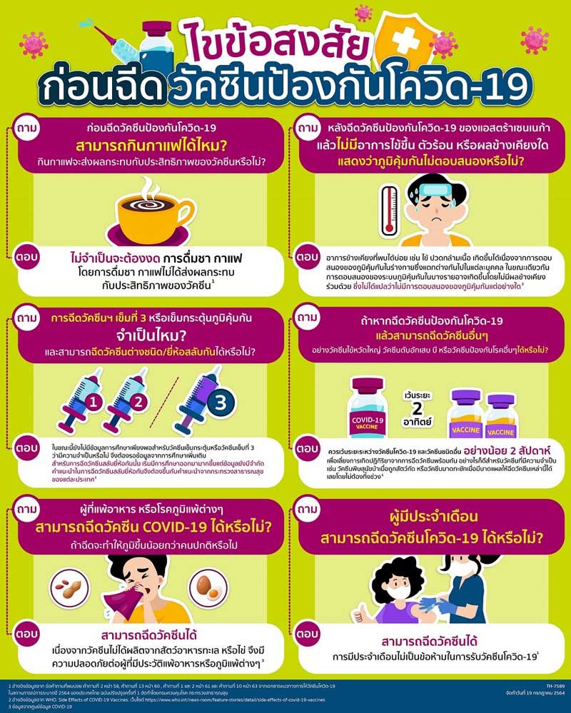 27 กรกฎาคม 2564 ท่ามกลางสถานการณ์การแพร่ระบาดของโรคโควิด-19 ที่ทวีความรุนแรงอย่างต่อเนื่อง ประเทศไทยได้ดำเนินการเร่งฉีดวัคซีนป้องกันโควิด-19 สร้างภูมิคุ้มกันให้กับประชาชนและยับยั้งการแพร่ระบาดของโรคโควิด-19 โดยในขณะนี้ยังคงมีข้อสงสัยในประเด็นต่าง ๆ เกี่ยวกับการฉีดวัคซีนป้องกันโควิด-19