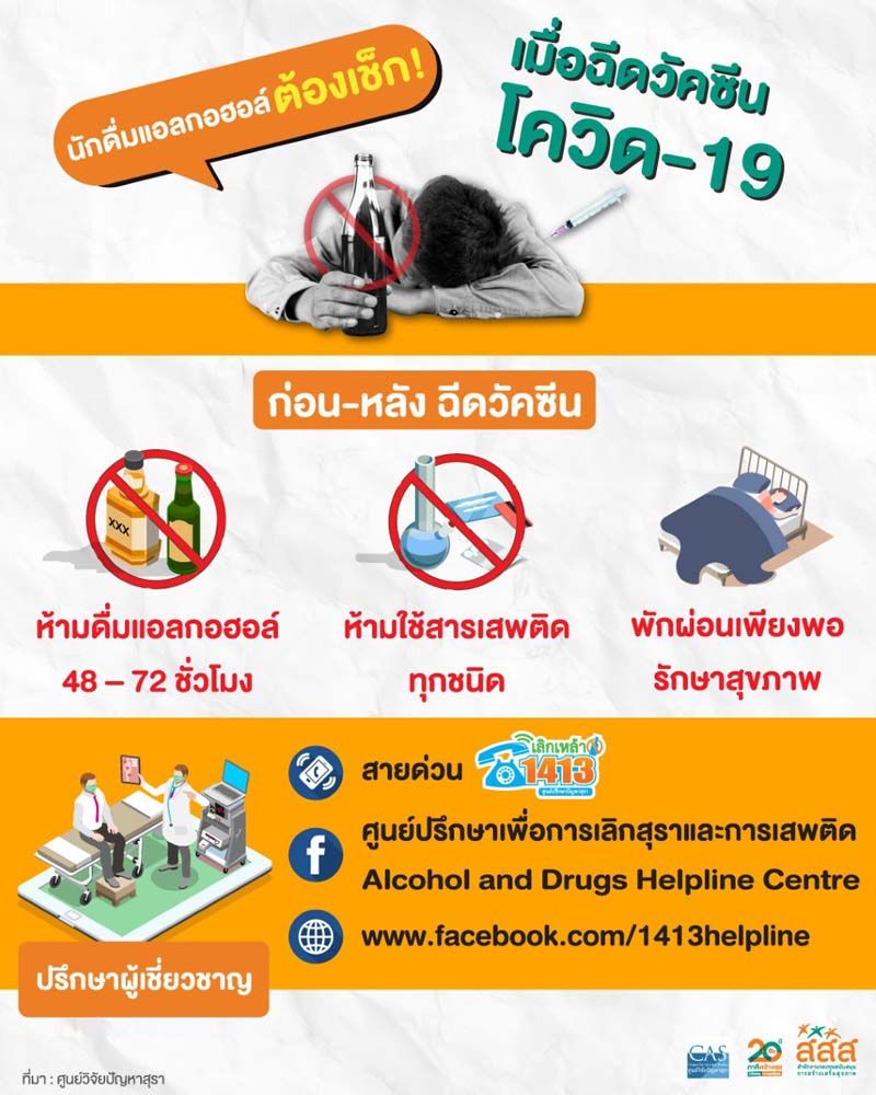 ทั้งนี้ การฉีดวัคซีนโควิด-19 ให้ผู้ที่ติดสุรา จะช่วยลดความเสี่ยงติดเชื้อโควิด-19 และลดความรุนแรงเมื่อติดเชื้อได้แต่อย่างไรก็ตาม ควรปฏิบัติตามมาตรการป้องกันการติดเชื้ออย่างเคร่งครัดและหยุดดื่มตลอดช่วงการแพร่ระบาดของเชื้อโควิด-19 โดยผู้ที่ต้องการเลิกดื่มเครื่องดื่มแอลกอฮอล์และสารเสพติดต่างๆ ตลอดชีวิต สามารถขอรับคำปรึกษาได้3 ช่องทาง ได้แก่ แฟนเพจเฟซบุ๊ค : ศูนย์ปรึกษาเพื่อการเลิกสุราและการเสพติด Alcohol and Drugs Helpline Centre สายด่วนเลิกเหล้า 1413 และเว็บไซต์ http://www.1413.in.th/