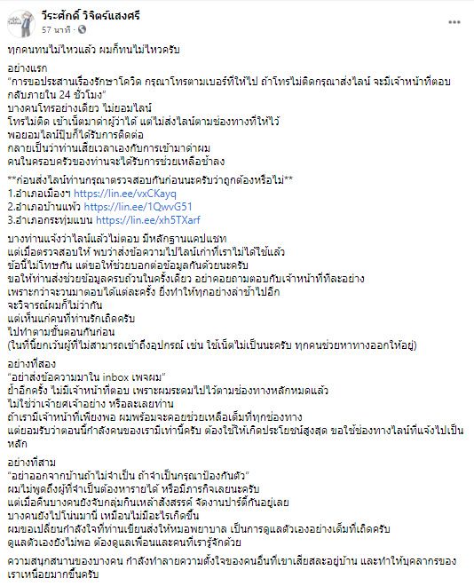 อย่างแรก “การขอประสานเรื่องรักษาโควิด กรุณาโทรตามเบอร์ที่ให้ไป ถ้าโทรไม่ติดกรุณาส่งไลน์ จะมีเจ้าหน้าที่ตอบกลับภายใน 24 ชั่วโมง”