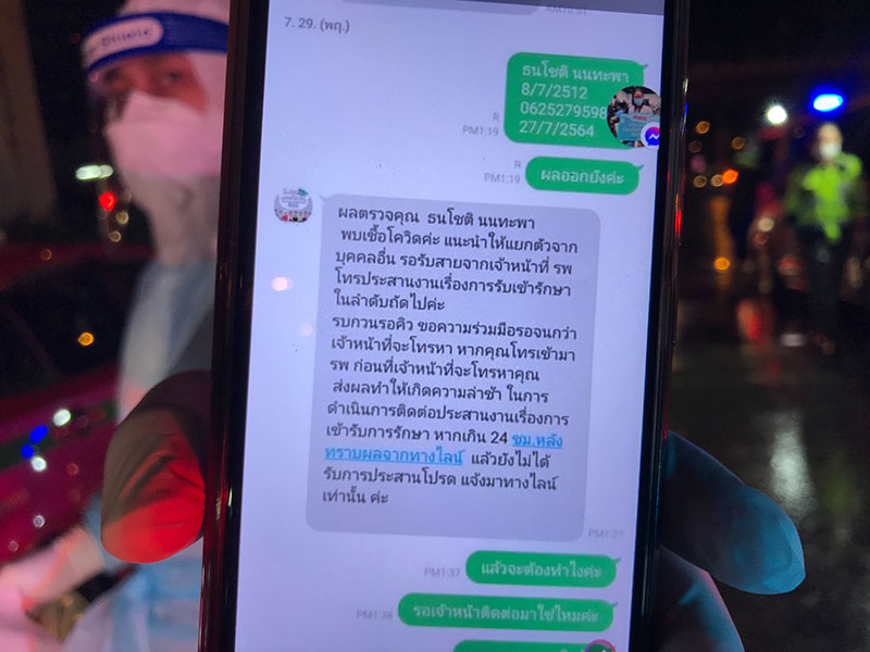 จนวันนี้ทางรพ.ได้ส่งผลตรวจแจ้งมาทางไลน์ว่าติดเชื้อโควิด ซึ่งอาการก็เริ่มรุนแรงขึ้นมีการหายใจไม่ออก เหนื่อยแน่นหน้าอก จึงได้พยายามจะขับรถไปรพ.ที่ใกล้ที่สุด แต่เมื่อขับมาถึงบริเวณใต้ทางด่วนแจ้งวัฒนะ ไม่สามารถขับรถไปต่อไหวจึงจอดรถข้างทางเพื่อขอความช่วยเหลือจากชาวบ้านที่อยู่ใกล้กับบริเวณนี้