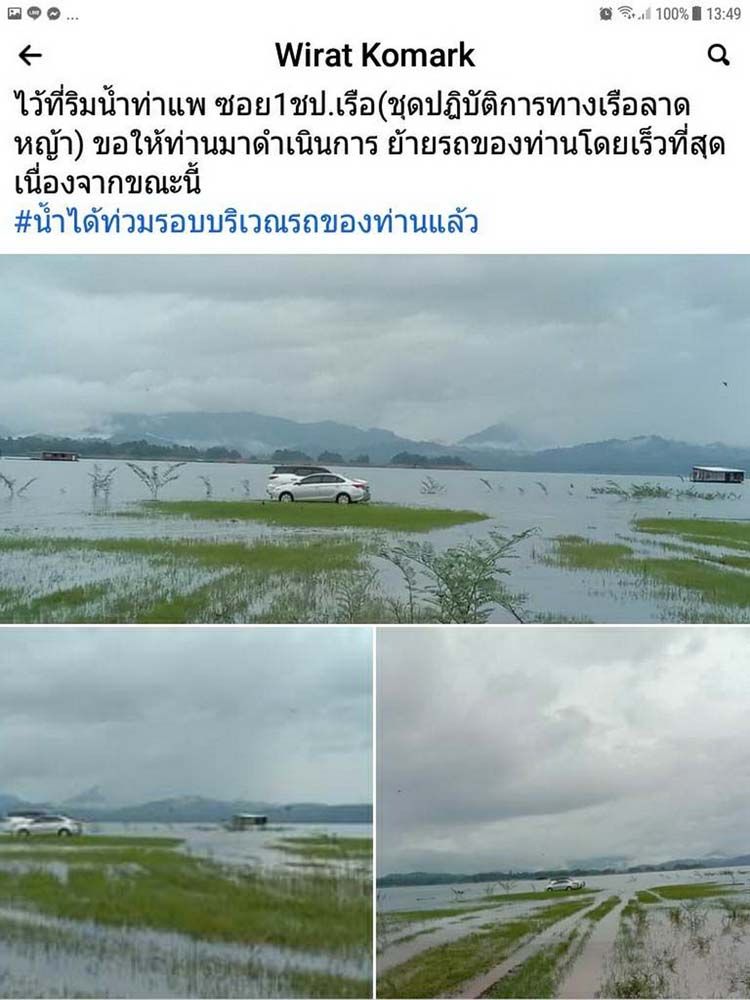 พร้อมข้อความระบุว่า “ขอแจ้งประชาสัมพันธ์ ท่านใดที่จอดรถยนต์ฟอร์จูนเนอร์สีขาว และรถยนต์เก๋งสีบรอนซ์เงิน ไว้ที่ริมน้ำท่าแพ ซอย1ชป.เรือ(ชุดปฎิบัติการทางเรือลาดหญ้า) ขอให้ท่านมาดำเนินการ ย้ายรถของท่านโดยเร็วที่สุด เนื่องจากขณะนี้ #น้ำได้ท่วมรอบบริเวณรถของท่านแล้ว”