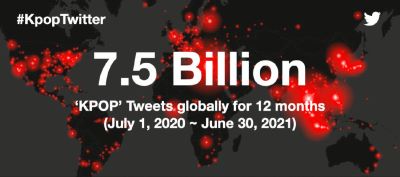 In the year from July 1, 2020 to June 30, 2021, there were 7.5 billion tweets about K-pop, setting yet another record for the most number of tweets annually related to K-pop, Twitter said.