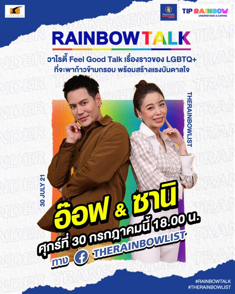 อ๊อฟ – ปองศักดิ์ รัตนพงษ์ ปังรัวๆ ภายหลังจากคว้าพรีเซนเตอร์ TIP Rainbow จาก ทิพยประกันภัย ประกันที่ตอบทุกโจทย์ความต้องการของ LGBTQ+ ล่าสุดขึ้นโปรเจกต์ใหม่ภายใต้ความร่วมมือกันระหว่าง บริษัท ซีเนริโอ จำกัด และ บริษัท ทิพยประกันภัย ผุดรายการ “Rainbow TALK (เรนโบว์ ทอล์ก)” ลิมิเต็ดทอล์กโชว์แบบฟีลกู๊ด บนเฟซบุ๊กแฟนเพจ The Rainbow List (เดอะ เรนโบว์ ลิสต์) พูดคุยถ่ายทอดเรื่องราวชีวิต ความรัก และทุกแง่มุมความคิดของ LGBTQ+ ในแบบสนุกสนาน โดยสองพิธีกรคู่ อ๊อฟ ปองศักดิ์ และ ซานิ นิภาภรณ์ โดยมีทั้งหมด 6 EP.