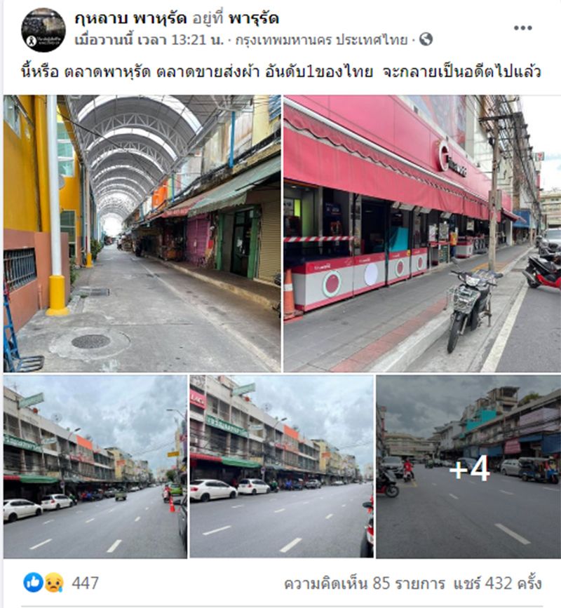 โดยผู้ใช้เฟซบุ๊กรายดังกล่าวระบุข้อความไว้ด้วยว่า “นี้หรือ ตลาดพาหุรัด ตลาดขายส่งผ้า อันดับ1ของไทย จะกลายเป็นอดีตไปแล้ว”