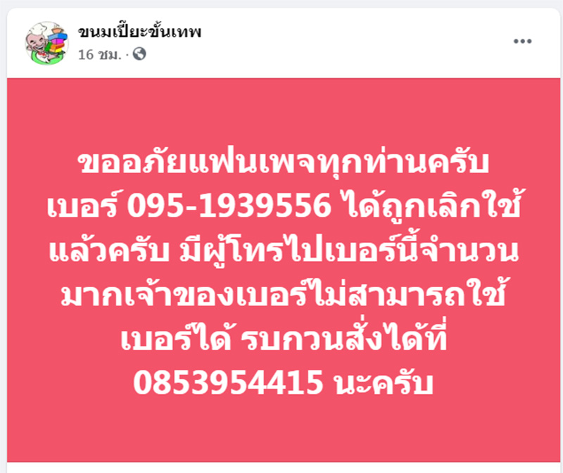 ล่าสุดวันนี้ (31 ก.ค.64 ) เฟชบุ๊กแฟนเพจ ขนมเปี๊ยะขั้นเทพ โพสต์แจ้งขออภัยแฟนเพจทุกท่านครับ เบอร์ 095-1939556 ได้ถูกเลิกใช้แล้วครับ มีผู้โทรไปเบอร์นี้จำนวนมากเจ้าของเบอร์ไม่สามารถใช้เบอร์ได้ รบกวนสั่งได้ที่ 0853954415 นะครับ