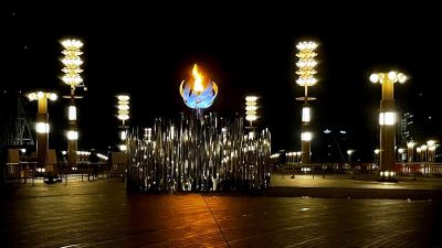 Late at night, on a bridge in Tokyo Bay, the Olympic flame burns alone
