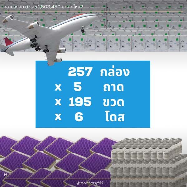 3 สิงหาคม 2564 เพจ “U.S. Embassy Bangkok” ของสถานทูตสหรัฐอเมริกา ประจำประเทศไทย โพสต์ภาพ พร้อมข้อความระบุว่า “ปุจฉา! วัคซีนไฟเซอร์กี่โดสเป็น 1 ขวด แล้วกี่ขวดเป็น 1 ถาด มาหาคำตอบเกี่ยวกับจำนวนวัคซีนที่ปลอดภัยและมีประสิทธิภาพที่สหรัฐฯ บริจาคให้กับไทยได้จากกราฟิกใหม่ที่เข้าใจง่ายของเรา”