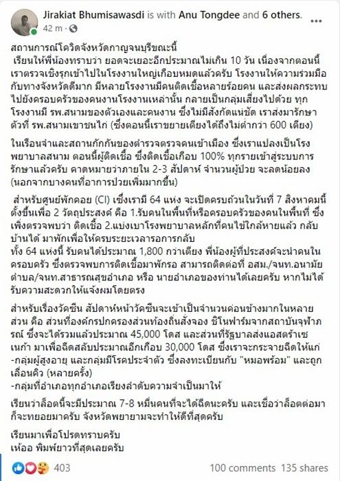 ผู้ว่าฯกาญจน์โพสต์เฟสบุ๊กอีกไม่เกิน 10 วันยอดผู้ติดเชื้อโควิดกาญจน์จะพุ่ง