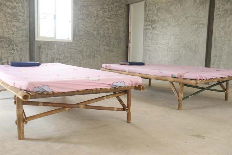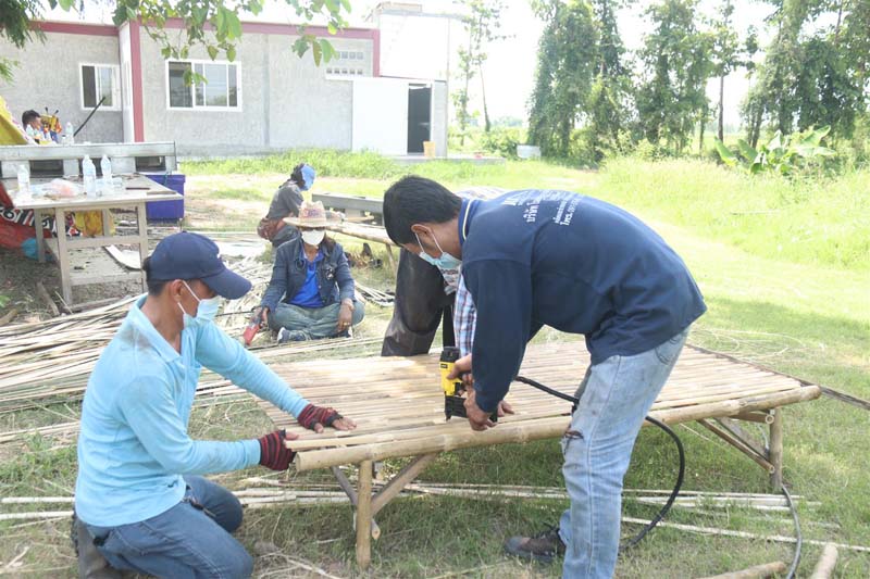 โดยการทำแคร่ไม้ไผ่ จากตัดไม้ไผ่ ที่ลำต้นมีความแข็งแรง แล้วนำ เจาะรู เพื่อยึดในการทำโครงของแคร่ จากนั้น ทำการนำเศษไม้ ที่ผ่าออกมาเป็นซี่ ทำพื้นที่ยึดติดด้วย ตะปู กับโครงสร้าง จนสำเสร็จเป็นแคร่ เตียงจากไม้ไผ่ จากนั้นนำเอาที่นอนสำเร็จรูป วางบนแคร่ไม้ไผ่ จนได้ เตียงผู้ป่วยสำหรับโรงพยาบาลสนามโดยขณะนี้ใช้เวลา 2 วัน เสร็จเรียบร้อยแล้ว 20 เตียง