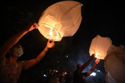 Family members of a firefighter martyr are offered his portrait at an art exhibition commemorating the martyrdom of 10 firefighters upon the first anniversary of the Beirut port blast in Beirut, Lebanon, Aug. 3, 2021.