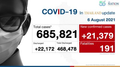 Thailand surpassed the 20,000 mark for a third day running with 21,379 new Covid-19 infections and 191 deaths on Friday.