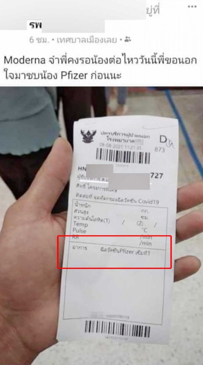9 ส.ค.64 ทำเอาโลกโลกออนไลน์แห่วิพากษ์วิจารณ์จำนวนมาก หลังจากที่มีผู้ใช้เฟซบุ๊กได้โพสต์ภาพ ซึ่งทำการแคปจากชาวเน็ตรายหนึ่ง ซึ่งเป็นการโพสต์ภาพบัตรคิวเข้ารับวัคซีนที่โรงพยาบาลแห่งหนึ่งในจังหวัดเลย โดยระบุชนิดวัคซีนคือ Pfizer (ไฟเซอร์) เข็มที่ 1 ในโครงการพิเศษ ซึ่งผู้โพสต์ระบุแคปชั่นด้วยว่า “Moderna จ๋า พี่คงรอน้องต่อไม่ไหว วันนี้พี่ขอนอกใจมาซบน้อง Pfizer ก่อนนะ”